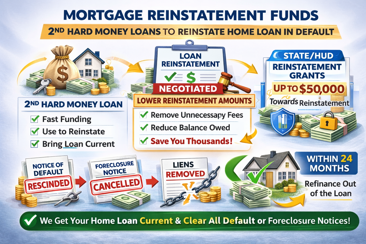 When a homeowner is facing foreclosure, time is everything. Mortgage reinstatement funds provide fast access to the money needed to bring a delinquent loan current, remove foreclosure notices, and restore the homeowner’s standing with their lender. Dream Financial Management specializes in securing reinstatement funds through multiple channels so you can protect your home and regain financial stability.
